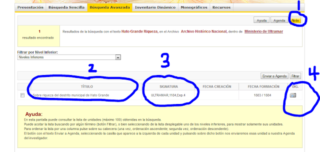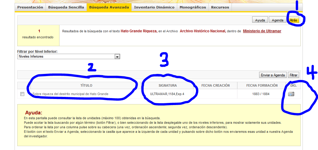 Now click on the Ministerio de Ultramar. You should see the below view. I’ve circled and numbered so that as I speak of them you’ll know what I’m speaking about. First and MOST IMPORTANTLY, do not ever use your back button on your browser. It does not play well with this website. Instead, use (see 1) Atras.  This is the only back button that will work well and never make a mess of what you searched for. If by any chance you did, then I highly recommend you begin again.