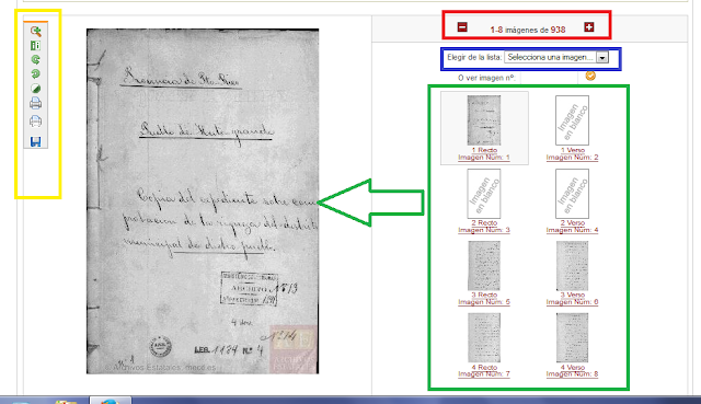 YELLOW:  Allows you to zoom into the image(click Atras to go back to small view), allows you to change the view (give it a try to see, just click again to change it back), allows you to turn clockwise and counterclockwise, change contrast, print one page or many pages and finally allows you to save the image to your computer.