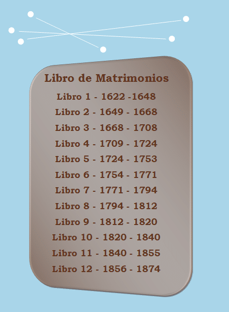 When it comes to marriage records, Santa Cruz y Mallen provides what books are available. The 12 books covers from 1622 to1874. This is over 250 years worth of marriage records! An impressive collection.